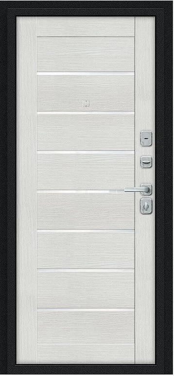Надежная входная Дверь Браво Техно/BChrome Букле черное/Bianco Melinga премиум класса по цене 35 047 руб. Большая толщина стали защитит от проникновения в ваш дом, квартиру или коттедж. Используется очень качественная фурнитура: замки, цилиндры, ручки, защелки. Покрытие и отделка двери изготовлено под внимательным контролем производителя. Дверь имеет долгий срок службы и гарантию.